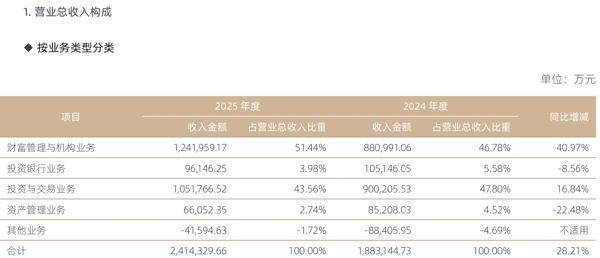 具体而言,财富管理与机构业务为公司第一大收入来源。年报显示,该业务主要为零售和机构客户提供证券及 期货 经纪、证券投资咨询、基金投资顾问等全价值链财富管理服务。2025年,财富管理与机构业务实现营业收入124.20亿元,同比增长40.97%,占营业总收入的比重为51.44%。