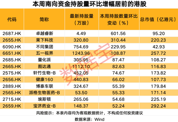 从持股量变化来看,本周12股获得南向资金持股量环比增长超50%, 卓越睿新 居首,环比增长601.56%,其他还有 果下科技 、 不同集团 、 五一视界 持股量环比增幅居前,持股量环比增幅分别为310.44%、229.95%、108.87%。