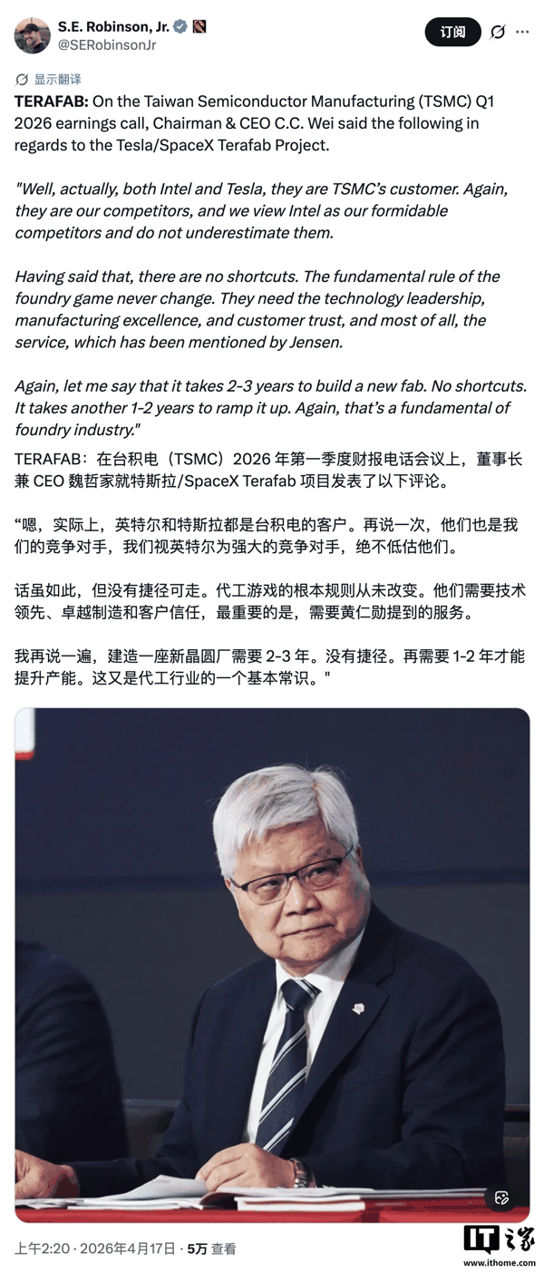 马斯克是在评论一则帖子时作出的评论的。这则帖子提到了台积电 CEO 魏哲家在财报电话会议上的表态。IT之家附上大意如下: