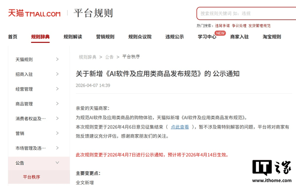 IT之家 4 月 14 日消息,据天猫官网上周公告,为规范 AI 软件及应用类商品的购物体验,天猫拟新增《 AI 软件及应用类商品发布规范 》,于今日(2026 年 4 月 14 日)正式生效。
