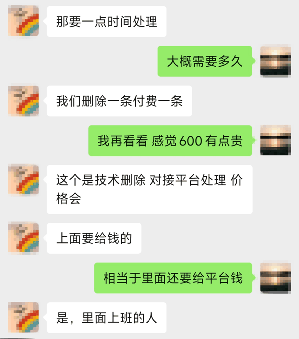 但也存在例外情况。沟通中,有删评人坦言,如果差评被删除,消费者会收到“评价违规不做展示”的平台提示。对方还称,他们会对接平台,通过技术手段删除差评,“删除一条付一次费,单条价格600元,我们会把钱付给平台内部人员,由他们操作删除”。