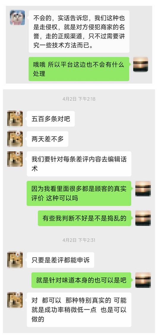 尽管平台对评论管理有明确规范,但记者调查发现,目前删差评已经形成了一条较为成熟的黑色产业链:有专门负责对接商家、洽谈价格的外联人员,会主动在各大电商平台、社交媒体评论区挖掘潜在客户;另有技术人员负责具体的删评操作,“我们就是抓住了平台恶意刷评筛查机制的漏洞”。此外记者还注意到,咨询过删评服务的商家联系方式会被行业共享。