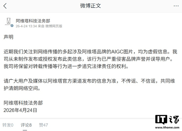 IT之家 4 月 24 日消息,阿维塔科技法务部今日发布声明,公开驳斥近期在网络流传的多起涉嫌利用 AIGC 技术生成的虚假品牌图片。