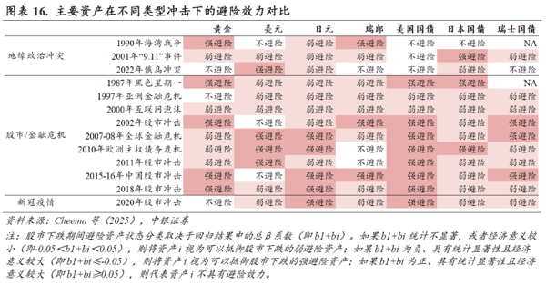 每逢市场动荡,市场机构对“避险资产”的讨论便会增多,但常常出现“避险资产”与“安全资产”概念混淆的情况。虽然两者有所重叠,实则并不相同:前者通常指在市场动荡时期能够保值甚至增值的资产,后者则指具有稳定名义回报、高度流动性且信用风险极低的资产。以 黄金 为例,“乱世买 黄金 ”意味着黄金被市场普遍视为具备避险属性的资产,但其价格的高波动性决定了黄金并非安全资产。除了黄金之外,美元、日元、瑞郎、美债等也被普遍认为具有避险属性。然而,从历史经验来看,不同资产在同一时期,以及同一资产在不同时期的避险效果存在显著差异。