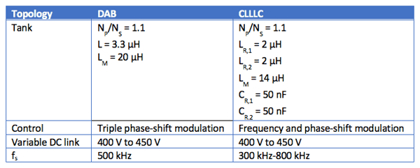 表 3 具有换向电感器 (LC) 值的 DAB 和 CLLLC 设计