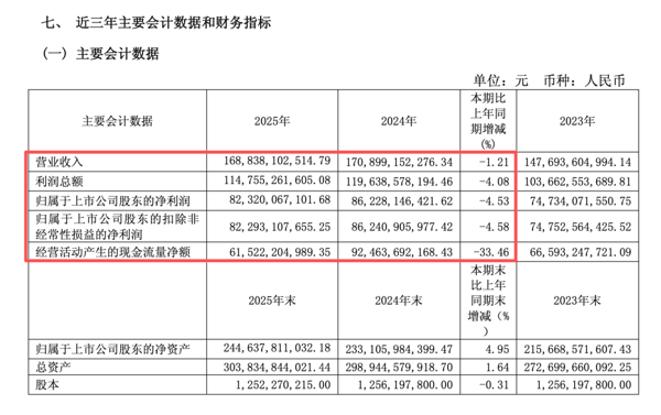年报显示, 贵州茅台 2025年营业收入1688.38亿元,同比下降1.21%;净利润823.2亿元,同比下降4.53%;扣非后净利润为822.93亿元,同比下降4.58%;经营活动产生的现金流量净额为615.22亿元,同比下降33.46%。