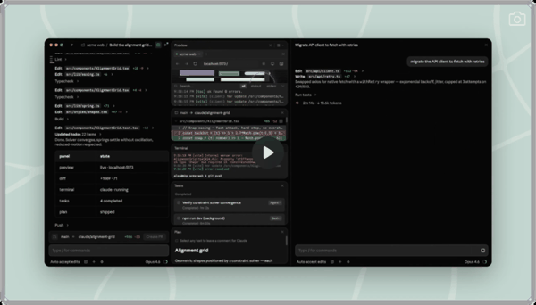 Claude Code 支持一个窗口内并行运行多个 Claude 会话,同时还新增了侧边栏管理会话、集成终端、文件编辑、HTML / PDF 预览、更快的 diff 查看器、拖拽式布局等多项新功能。
