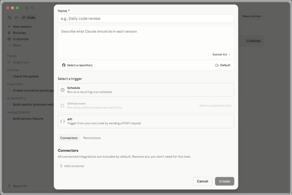 顾名思义,它是把这些可重复执行的日常任务,完全自动化,支持定时和触发运行。同时,这些任务可以跑在 Anthropic 的 Web 基础设施上,不依赖于本地 Mac 在线。