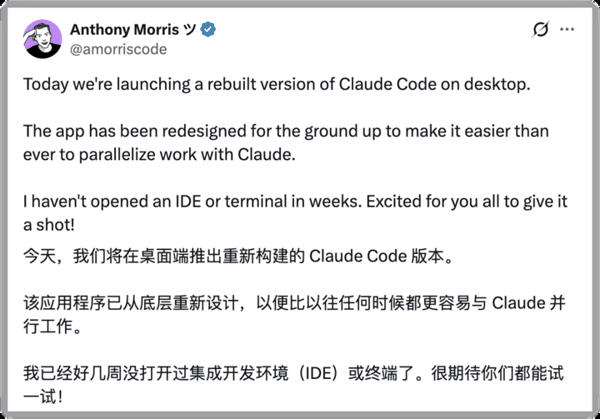 Claude Code 桌面端负责人 Anthony Morris 也发推文说,他自己连续好几周没有用过终端、代码编辑器、集成开发环境这类产品了。