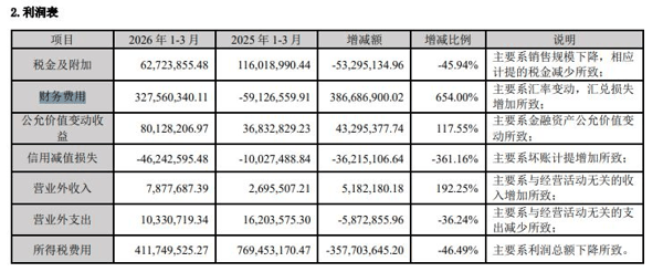 拆解财报核心数据可见,2026年第一季度业绩受多重影响。其中,阳光电源的财务费用达到3.28亿元,而上年同期该数据为-5912.66万元,同比增幅高达654%。对于这一巨大变化,财报中明确指出:“主要系汇率变动,汇兑损失增加所致”。