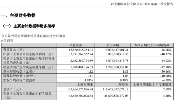 阳光电源2026年一季度净利降四成:财务费用增超6倍,预付款增逾200%