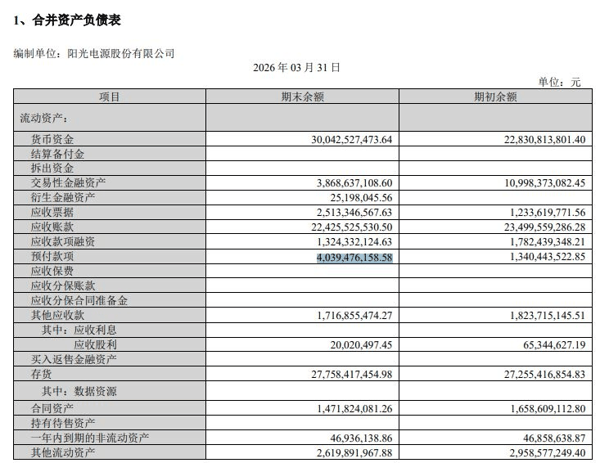 除了营收和利润下降,财报数据显示,截至一季度末,阳光电源的预付款项期末余额达到40.39亿元。相比之下,截至2025年12月31日,该数据为13.40亿元。短短三个月内,预付款项激增26.99亿元,增幅高达201.35%。