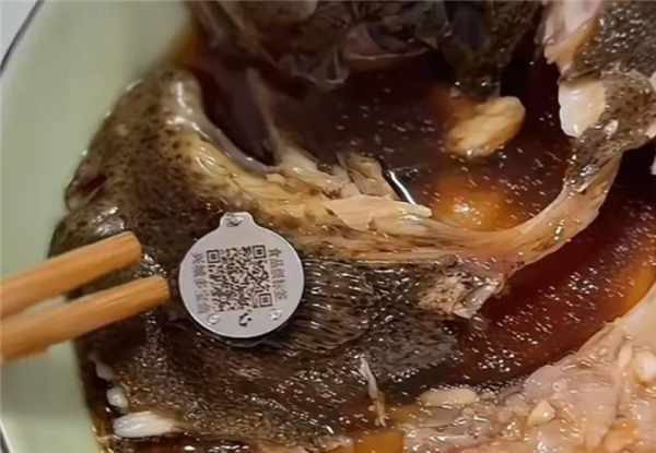 快科技4月14日消息,今日,有网友发视频称,家人在胖东来购买的多宝鱼在快吃完时,发现鱼身附着一枚带二维码的金属状标签。