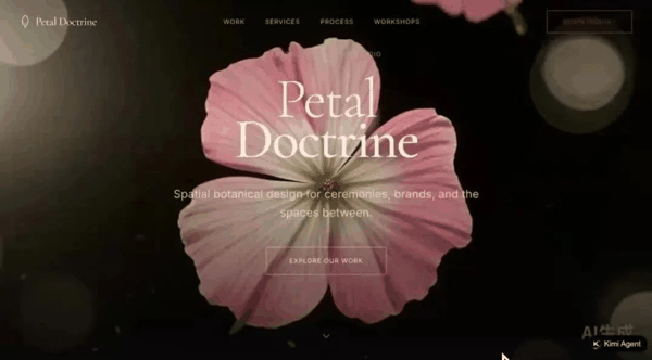 在代码驱动设计方面,K2.6 的 Agent 模式能够制作具有设计感和视觉冲击力的网站。凭借对图像和视频生成工具的熟练调用,该 Agent 可以生成视觉风格高度统一的素材,构建视觉焦点突出的首屏区,并实现交互元素和滚动触发动效。
