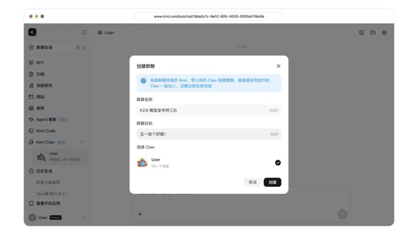月之暗面同时宣布开启“Claw 群组”小范围内测。该群组的目标是让多个 Agent 与人类作为真正的协作者共同运行,用户可以接入来自任何设备、任何供应商、运行任何模型的全天候 Agent(首批支持 OpenClaw,后续将加入对 Hermes Agent 等框架的支持),每个 Agent 可携带各自的专业工具包、技能和持久化记忆上下文。