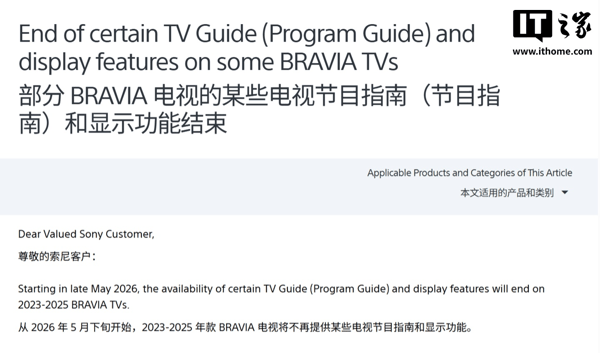 IT之家 4 月 15 日消息,科技媒体 Ars Technica 昨日(4 月 14 日)发布博文,报道称索尼计划于 2026 年 5 月下旬开始, 削减部分 Bravia 智能电视功能,影响 2023 至 2025 年款机型,直接影响使用天线或机顶盒的用户群体。