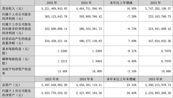 2025年,中宠股份实现营业收入52.21亿元, 同比 增长16.95%;但归母净利润为3.65亿元,同比下滑7.28% ,扣非净利润同比下降8.73%。