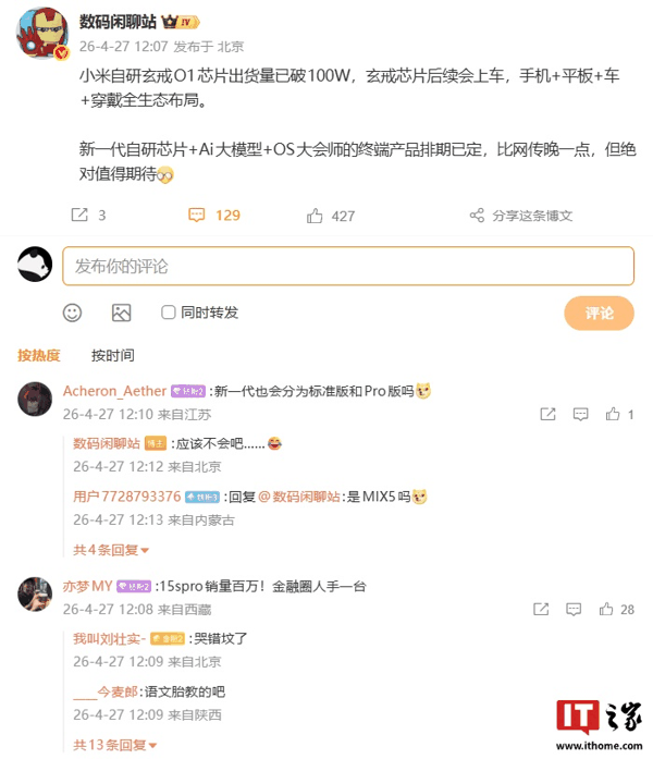 博主 @数码闲聊站 今日发文称,玄戒芯片后续会完成手机 + 平板 + 车 + 穿戴全生态布局。他透露, 新一代自研芯片 + Ai 大模型 + OS 大会师的终端产品排期已定 ,比网传晚一点(具体时间暂未公布)。