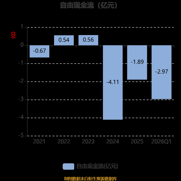 截至2026年一季度末,公司经营活动现金流净额为-1.91亿元,同比减少1.13亿元;筹资活动现金流净额2.43亿元,同比增加1.9亿元;投资活动现金流净额-1.06亿元,上年同期为-297.52万元。