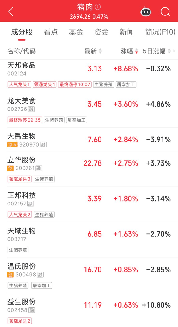 4月22日早盘,猪肉板块强势拉涨,随后回落。截至10:11, 天邦食品 涨超8%, 温氏股份 涨0.85%, 牧原股份 由红转绿。