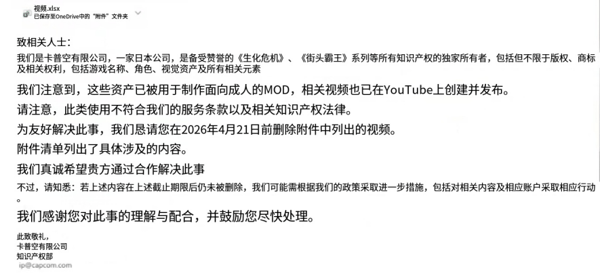 “战绩可查” 卡普空在邮件中明确指出,自身游戏资产被用于制作面向成人的MOD,相关视频在YouTube上创建并发布,这违反了最终用户授权协议(EULA)以及相关知识产权法。