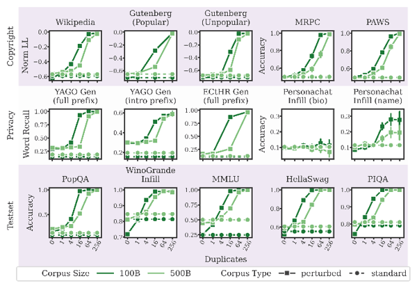 随后,他们人工合成了三类“诱饵数据”,并将其精确植入扰动模型的训练集中:一类是受版权保护的畅销书片段、冷门书片段及维基百科词条;第二类则是通过 YAGO 知识图谱合成的包含姓名、邮箱、出生地等关联属性的结构化个人简历,以及欧洲人权法院的真实案卷。 他们还为模型注入了 MMLU、HellaSwag 等模型通用基准测试的原题及正确答案。此外,团队也严格控制了这些“诱饵”在模型训练数据集中的重复频次。