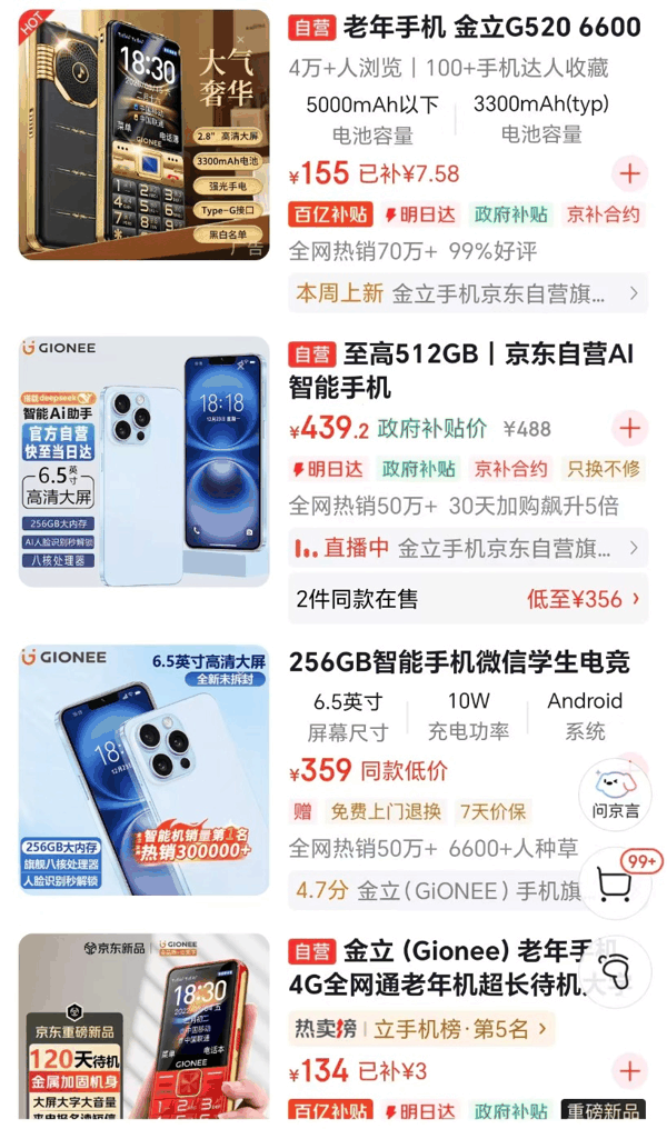 界面新闻查询 京东 商城发现,多款金立手机仍在进行销售,以老年手机为主。其中,一款标注为“金立G520”的老年手机,于去年3月上市,目前售价154元,销售量超过70万。