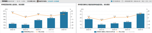 2026年一季度,海康威视实现单季营收207.15亿元,同比增长11.78%;归母净利润27.81亿元,同比大涨36.42%,连续第5个季度的利润增速提速。