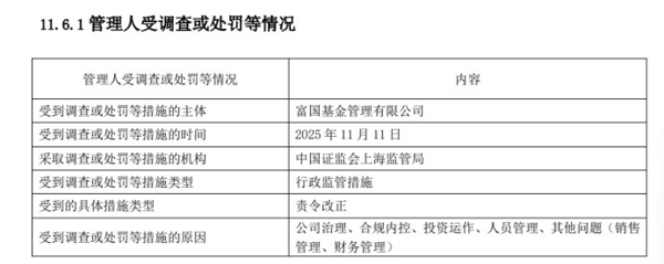 信披资料显示,2025年11月11日,富国基金因公司治理、合规内控、投资运作、人员管理、其他问题(销售管理、财务管理)违规,被中国证券监督管理委员会上海监管局责令改正。