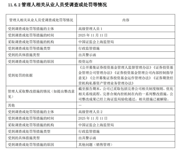 对比 2024 年的处罚公告不难发现,当2024年上海证监局对督察长出具警示函时,富国基金在年报中明确披露了受罚主体为 “督察长”,信息清晰可追溯;但在 2025 年的本次处罚中,公告仅以 “高级管理人员1”、“高级管理人员2” 一笔带过,既未透露涉事高管的具体姓名,也未明确其职务,更未说明两人在违规事项中承担的具体责任。