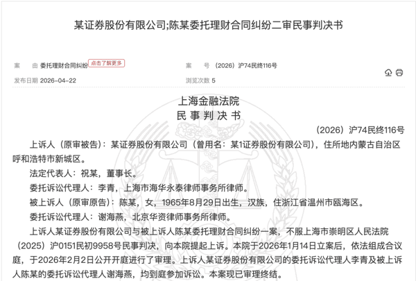 公开信息显示,金融街证券的前身是成立于1992年的内蒙古证券,2002年增资扩股后更名为恒泰证券,并于2015年港交所上市。2025年9月,公司完成工商变更,由“恒泰证券”更名为 “金融街证券”。因此可见,该案发生在“恒泰证券”时期。