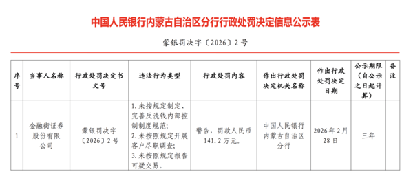 2026年3月6日,中国人民银行内蒙古自治区分行行政处罚决定书显示,金融街证券因未按规定制定、完善反洗钱内部控制制度规范,未按照规定开展客户尽职调查、报告可疑交易,被给予警告,并处罚款人民币141.2万元。