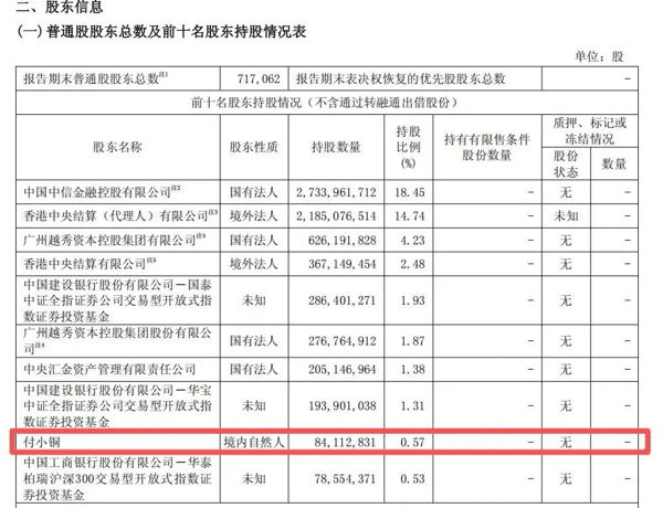 其中,自然人付小 铜 新进成为 中信证券 前十大股东,位列第九名。截至报告期末,持股数量为8411.28万股,持股比例为0.57%。