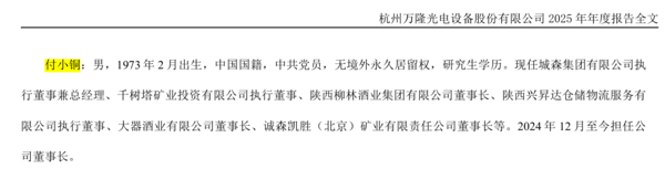 万隆光电 2025年年报显示,53岁的付小铜,2024年12月至今担任公司董事长,现任城森集团执行董事兼总经理、千树塔矿业投资执行董事、陕西柳林酒业董事长、陕西兴昇达仓储 物流 执行董事、大器酒业董事长、诚森凯胜(北京)董事长等。