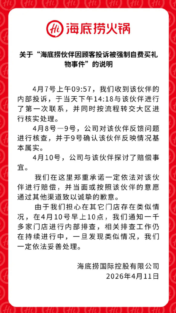 海底捞回应员工被强制买礼物:情况基本属实,已沟通赔偿并开展千店排查