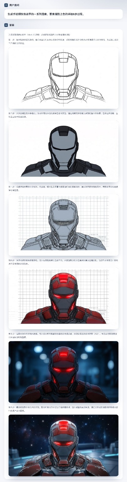 又比如让它绘制一个 钢铁 侠图案:它可以从扫描草稿出发,逐步进行连续创作,最终做出一个完成度很高的图像。每一步创作的过程对于前一步的结构和细节都做了精准的保持——一个统一表征的共享上下文在其中发挥了关键作用。