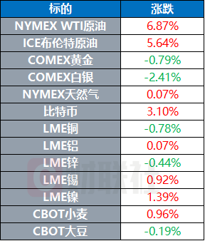 WTI原油 期货 结算价收涨6.87%,上涨5.76美元,报89.61美元/桶。布伦特原油 期货 结算价收涨5.64%,上涨5.10美元,报95.48美元/桶。