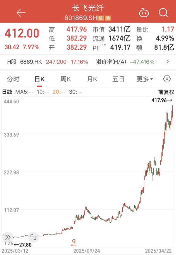 4月22日,A股光纤板块持续走强,龙头 长飞光纤 盘中大涨超9%,股价再创 历史新高 ,截至收盘报412元/股,涨幅达7.94%,年内涨幅已达254.07%。