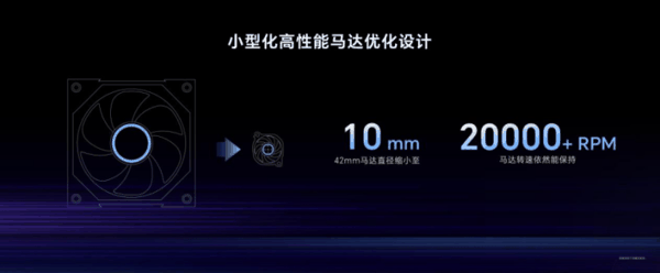 同时在笔记本内部结构进行创新,利用游戏本尾部空间布局内吹风道,并联4颗自研高性能轴流风扇,搭配2颗大功率离心主风扇,直接把整个风道吹透。轴流风扇还做到了小型化突破,马达直径压缩到10mm,转速能达到20000+RPM;