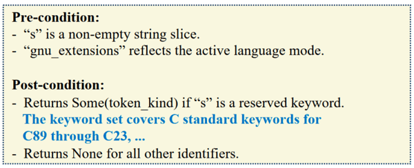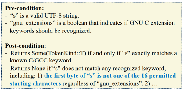 图丨上:只依赖函数实现生成的规约,Pre-condition 描述函数参数的含义,Post-condition 描述函数返回值满足的条件;下:FM-Agent 生成的规约,可以看到它描述的是覆盖全部关键字的目标(来源: arXiv )
