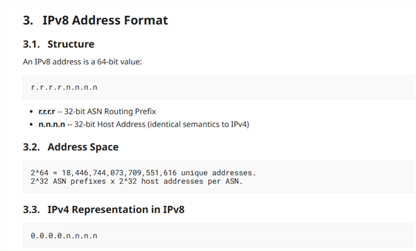 IPv8最核心的设计亮点是100%向下兼容IPv4。 草案明确,IPv4是IPv8的一个真子集。 根据草案定义,IPv8采用64位地址空间, 格式为r.r.r.r.n.n.n.n, 由32位ASN路由前缀和32位主机地址组成。