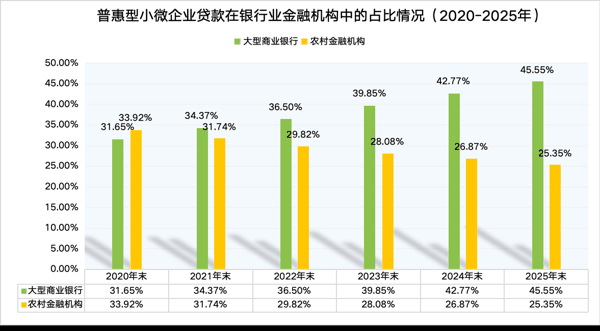 根据金融监管总局发布的2025年 银行 业金融机构普惠型小微企业贷款情况,截至2025年四季度末,大型商业 银行 的此类贷款在银行业金融机构中的占比达到45.55%,已接近半壁江山,且从一季度至四季度呈逐步提升态势。农村金融机构的占比则逐季下降,四季度末降至25.35%,仅占四分之一的市场份额。