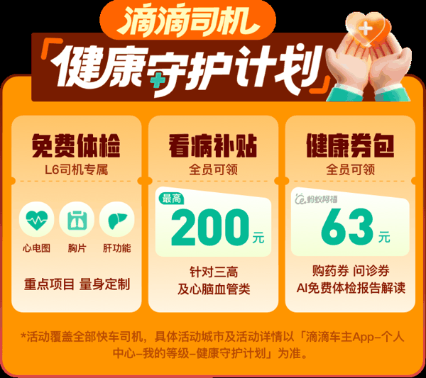 滴滴始终关注司机师傅的健康,于4月升级了“滴滴司机健康守护计划”,为全国快车司机提供针对三高及心脑血管问题的季度健康补贴。同时,滴滴联合互联网健康平台,首批与蚂蚁阿福合作,为司机提供在线问诊和线上购药优惠。部分城市的L6 高等级司机还可享年度免费定制体检。