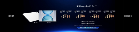 荣耀MagicPad3 Pro 12.3现已在荣耀商城、授权电商平台、荣耀体验店、授权零售门店等官方销售渠道开售,4月23日至5月17日期间,购买荣耀MagicPad3 Pro 12.3限时赠送价值499元原装智能键盘、学⽣认证送价值399元荣耀Magic-Pencil 4s手写笔;4月23日至5月10日期间,享6期免息分期;4月23日至5月31日期间,99元购价值238元2年碎屏宝、以旧换新补贴额外补贴100元,组合购原装智能触控键盘和荣耀Magic-Pencil 3触控笔⾄⾼优惠300元等福利权益。所有福利,数量有限,先到先得。荣耀MagicPad3 Pro 12.3国补优惠价3499元起。