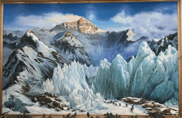 那幅名为《献给敢于攀登科学高峰的同志们》的作品中,画面描绘了层层叠叠直插云霄的雪峰,山脚下,几个豆粒大的身影正仰望峰顶,准备攀登。