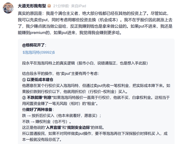 有投资者问段永平“通过卖put的方式买入泡泡玛特的原因”。