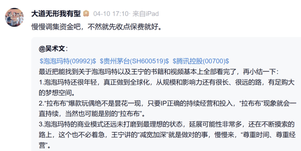 4月9日,段永平公开表示,“我的泡泡玛特保险公司正式开张了”。