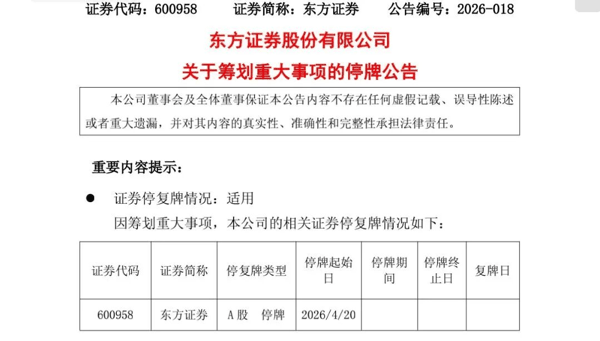 东方证券 表示,鉴于该事项存在重大不确定性,为维护投资者利益,避免股价异常波动, 东方证券 A股股票将于4月20日(星期一)开市起停牌,预计停牌时间不超过10个交易日。