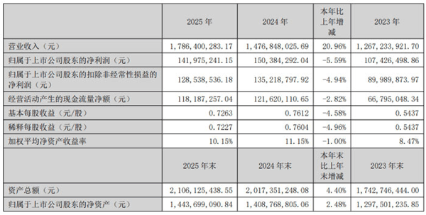 财务数据显示,2025 年天山电子实现营业收入 17.86 亿元,同比增长 20.96%;归属于上市公司股东的净利润 1.42 亿元,同比下降 5.59%;扣除非经常性损益后的净利润 1.29 亿元,同比下降 4.94%;经营活动产生的现金流量净额 1.18 亿元,同比下降 2.82%。截至 2025 年末,公司资产总额 21.06 亿元,同比增长 4.40%;归属于上市公司股东的净资产 14.44 亿元,同比增长 2.48%;加权平均净资产收益率 10.15%。