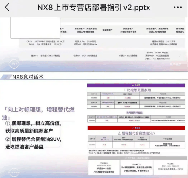 有业内人士向 媒体 提供了多份来自东风日产内部的传播内容。如在一份东风日产通发专营店的培训材料中,明确标明 “向上对标理想,增程替代燃油”,还有诸如“比理想更懂家用”等话术。